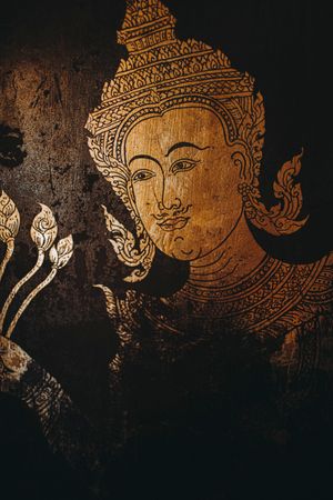 Remains of the Wat Phra That Doi Suthep wooden door in Chiang Mai featuring Buddha in the Ayutthaya art style. Ayutthaya's art style is known to have been influenced by many, such as U Thong (first king of the Kingdom), Sukhothai, the Khmers and, as seen on the photo, a more fashionable style where Buddha is adorned with crowns and robes.