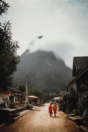 Monks walking in the morning fog of Muang Ngoy, Laos. This village has one single road. The only way to get there is by traditional wooden composite boats, on the Nam Ou river. And it's a long way there.