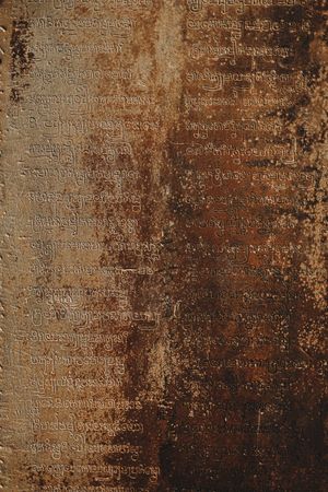 Details of Sanskrit inscriptions carved into stone within a Hindu temple of the Angkor Thom complex. Such inscriptions recorded royal dedications, religious foundations and cosmological concepts, reflecting the deep influence of Indian culture and Hindu belief systems on the Khmer Empire.
